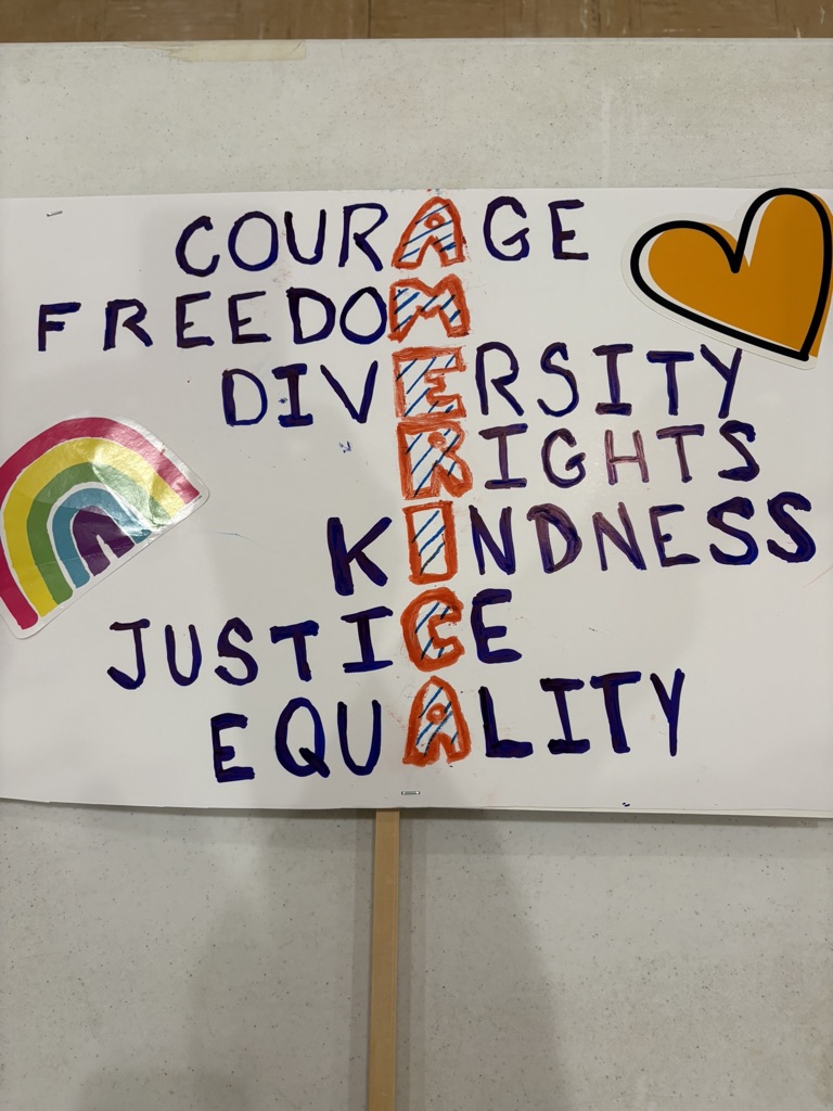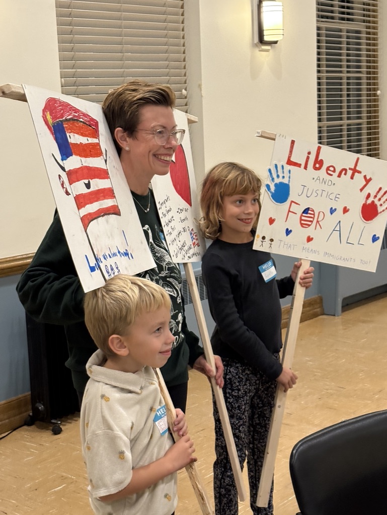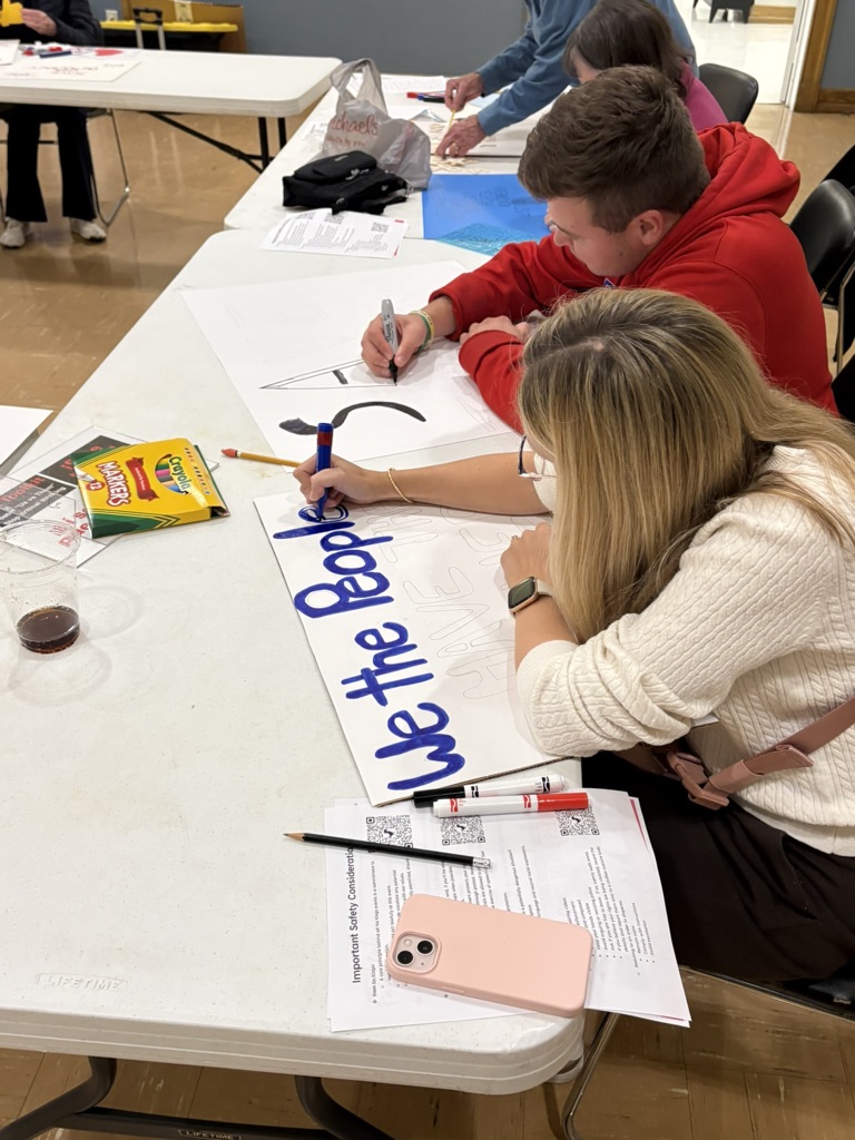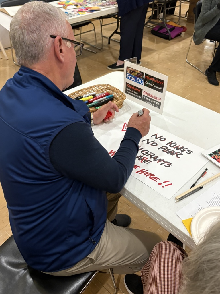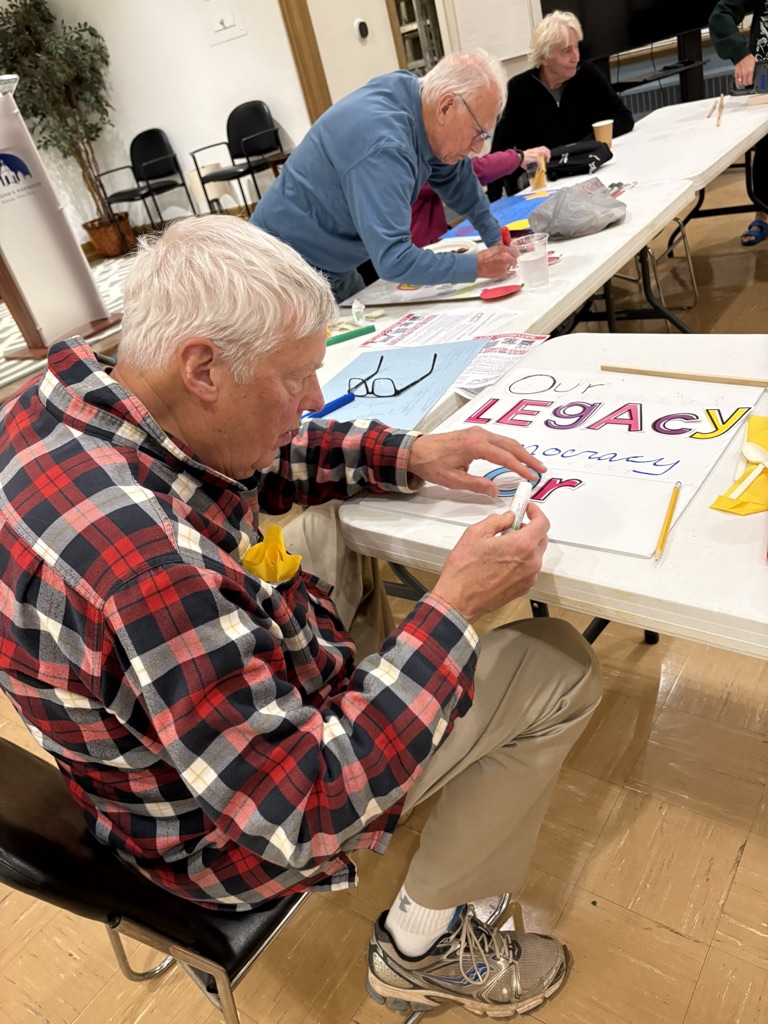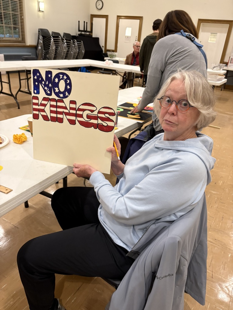 The second two-hour event was a group meeting to discuss how individuals can become more engaged in influencing current political issues. It was followed by a sign-making, pizza-fueled party at a local church’s social hall. About 25 people gathered to learn and prepared to participate in the coming Saturday’s No Kings rallies around the country.