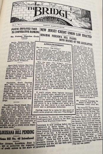 The first national credit union mewspaper appeared in June 1924. Called The Bridge, the lead articles included: Postal Employees Take to Cooperative Banking and New Jersey Credit Union Law Enacted.