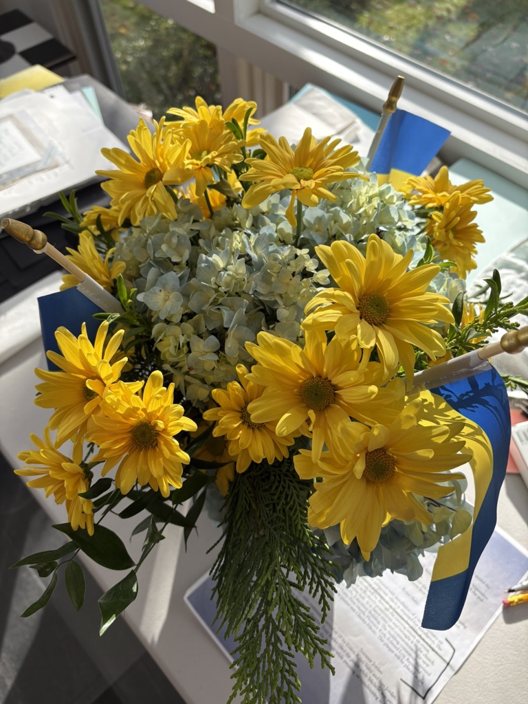 Over 60 people attended with table centerpieces in yellow and blue bouquets and small Ukrainian flags.